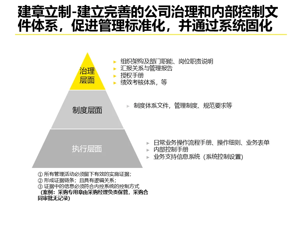文档提出"三个关联、四个目标、五个层面"的评估体系,强调制度流程需满足完整性、合理性、有效性、先进性及规范性五大标准。针对企业普遍存在的制度层次不清、流程断点、授权机制缺陷等问题,提出基于业务价值链的流程重构方法,通过财务体系优化案例展示如何将研发、采购、生产、销售等环节的业务活动与财务职能深度整合。