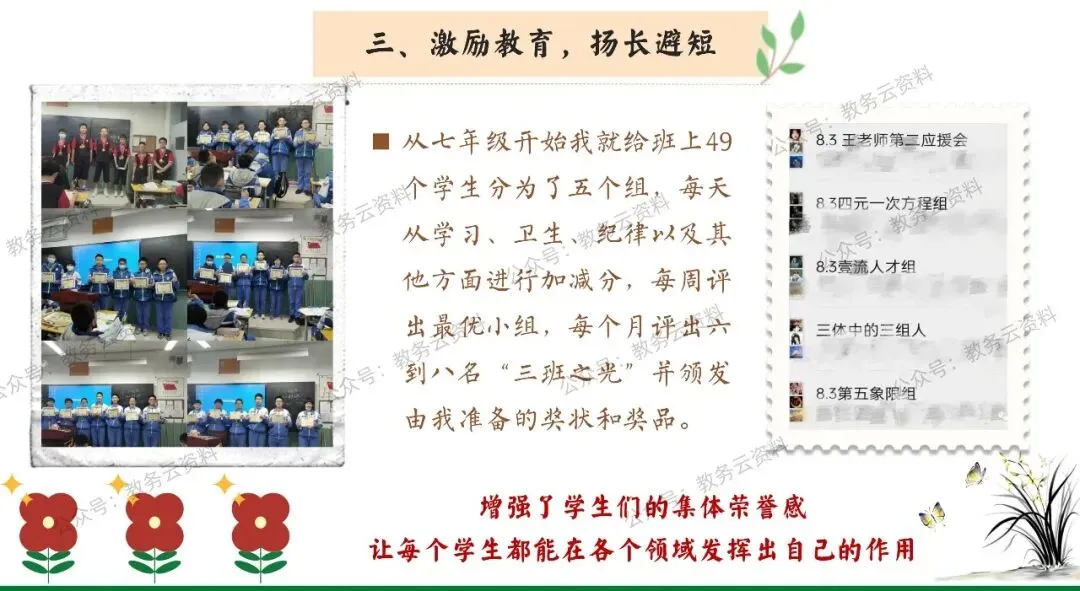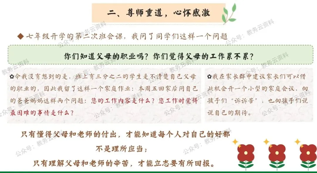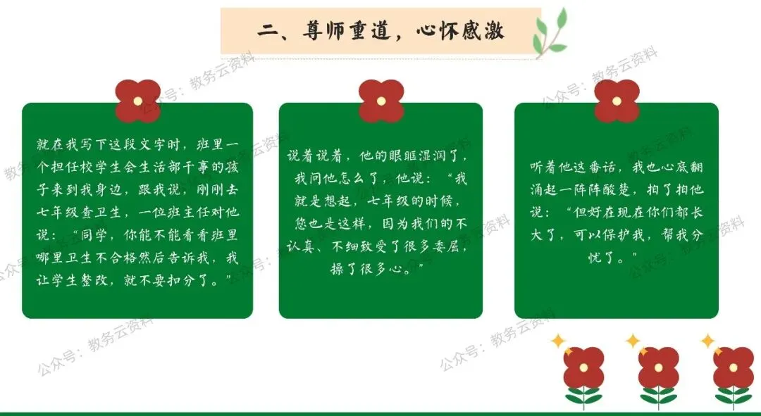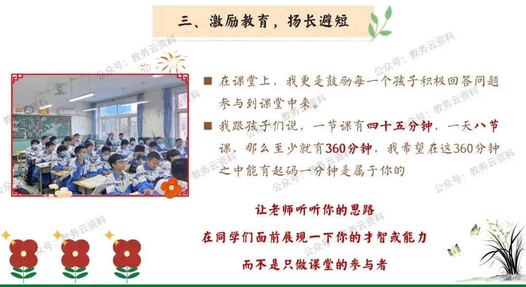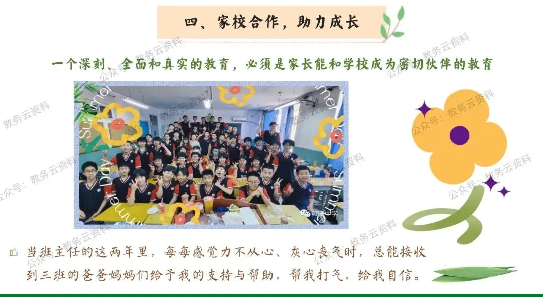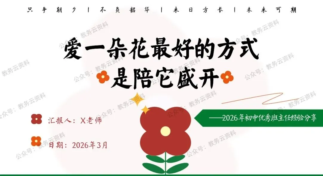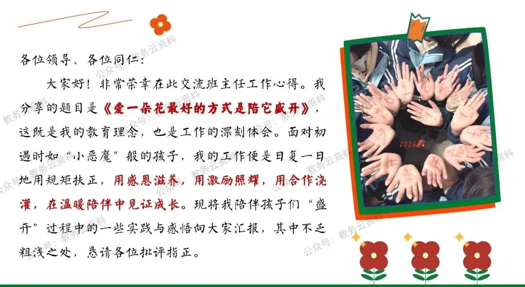 今天分享的是一位优秀初中班主任的成长故事,主题是《爱一朵花最好的方式是陪它盛开》,配套工作经验分享发言稿。