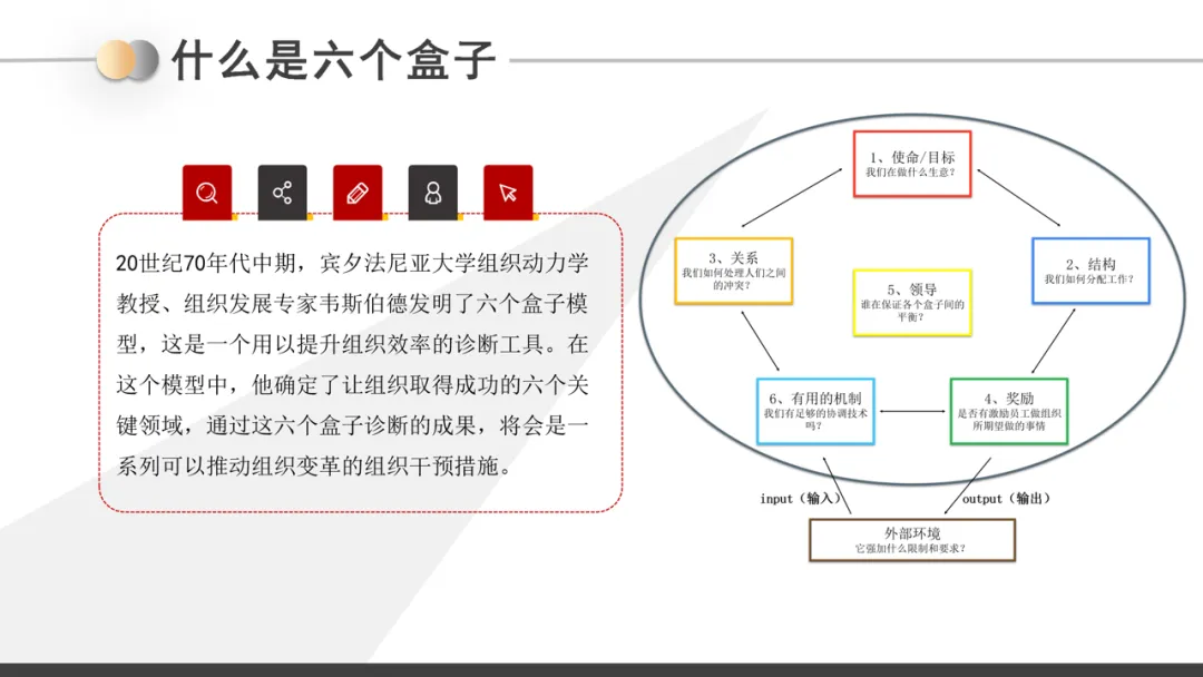 六个盒子模型由组织发展专家韦斯伯德于 20 世纪 70 年代中期提出,通过聚焦六大关键领域诊断组织问题、推动变革,诊断需历经两大阶段 10 个步骤。
