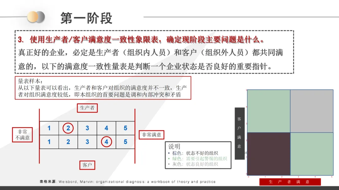 步骤 3:运用生产者 / 客户满意度一致性象限表,通过 1-5 分满意度评分,定位组织当前核心问题,绿色代表状态良好、灰色需警惕、棕色为状态不佳。