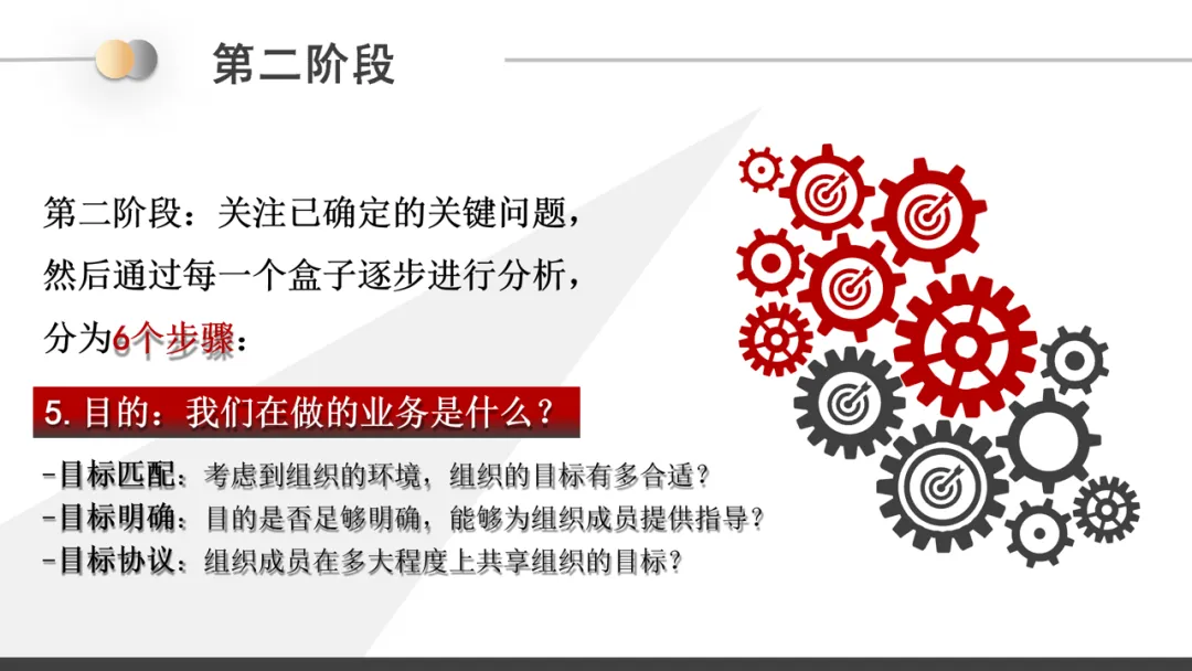 步骤 5:使命 / 目标诊断,核心关注目标与环境的适配性、目标清晰度及组织成员对目标的共识度,明确 “组织在做什么生意”。
