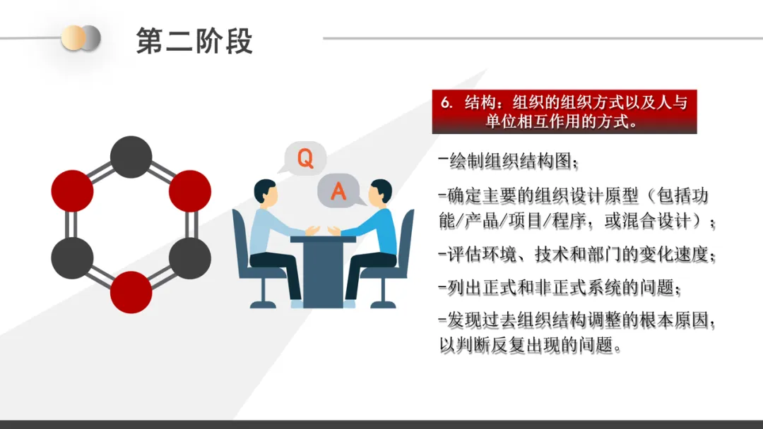 步骤 6:结构诊断,绘制组织结构图,确定功能、产品、项目等设计原型,评估环境与部门变化速度,排查正式与非正式系统问题及历史调整根源。