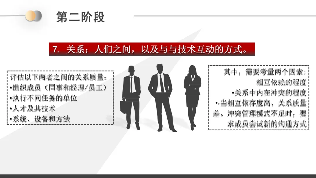 步骤 7:关系诊断,评估组织成员间、部门间、人与技术间的关系质量,考量相互依赖程度与内在冲突,优化沟通模式。