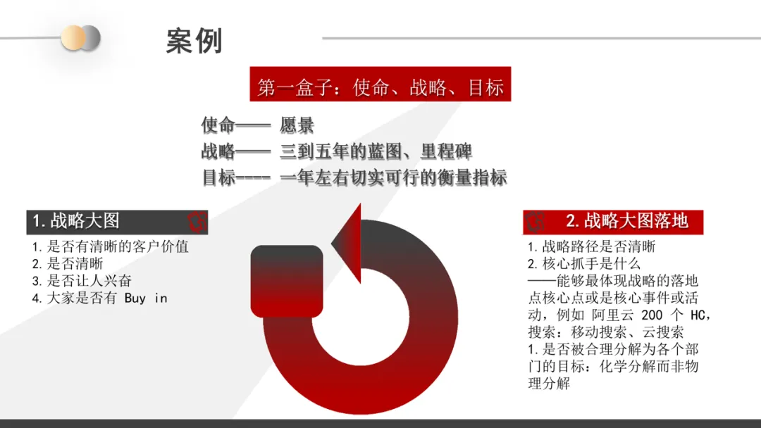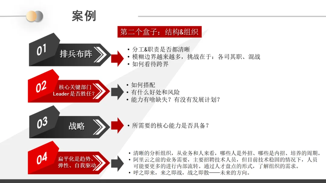 经过中国本土企业改良,六个盒子模型在组织诊断中展现出实用价值,阿里云的实践具有典型参考意义: