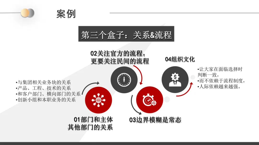 关系 & 流程:不仅关注官方流程,更重视民间协作模式,梳理与集团、客户及横向部门的关系,以组织文化统一决策判断,适应边界模糊的跨界协作常态。