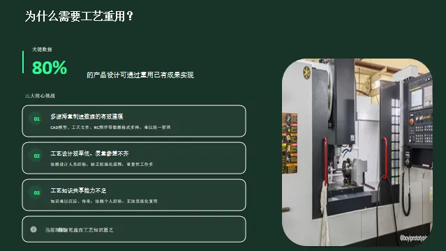 那么,为什么我们需要工艺重用技术呢?这里有一个非常关键的数据:约80%的产品设计可以通过重用已有设计成果来实现。但是,在实际工作中,我们面临着三大挑战:第一,多源海量的制造数据难以有效建模;第二,工艺设计效率低、质量参差不齐;第三,工艺知识共享能力不足。简而言之,我们现在的状况是"数据充盈而工艺知识匮乏"。这就是为什么工艺重用技术如此重要,它能够帮助我们从海量数据中提炼出有价值的工艺知识,提升设计效率和质量。