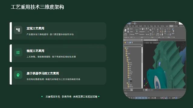 接下来,让我们看看工艺重用技术的三维度架构体系。这个框架包括三个相互补充的维度:第一是宏观工艺重用,它关注产品整体的加工路线重用;第二是微观工艺重用,它实现工艺参数和策略的精准提取;第三是基于机器学习的工艺重用,它能够处理非结构化数据。这三者不是相互独立的,而是相互补充、协同作用,共同支撑起新产品的工艺规划过程。理解这个架构,就掌握了工艺重用技术的整体框架。