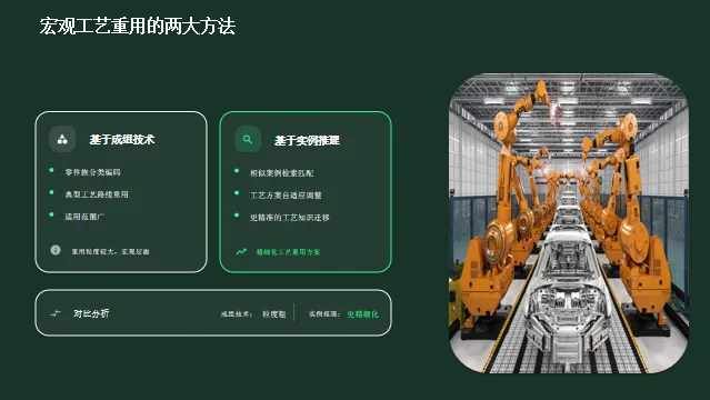 现在,让我们深入探讨宏观工艺重用的两大核心方法。第一种方法是基于成组技术,它通过零件族分类编码,实现典型工艺路线的重用。这种方法适用范围广,但重用粒度相对较粗。第二种方法是基于实例推理,它通过相似案例的检索匹配,实现工艺方案的自适应调整。这种方法更加精细化,能够实现更精准的工艺知识迁移。大家可以根据实际应用场景选择合适的方法。成组技术适合宏观层面的快速重用,而实例推理则更适合需要精细化调整的场景。