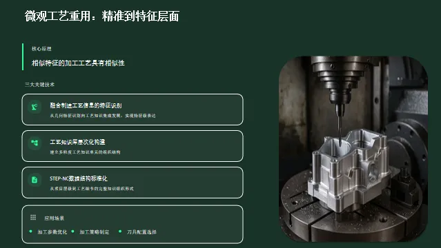 接下来我们深入微观层面。微观工艺重用的核心原理很简单:"相似特征的加工工艺具有相似性"。比如一个通孔特征,无论它出现在哪个零件上,其加工方法和参数都是相似的。这带来了三大关键技术:第一是融合制造工艺信息的特征识别,将工艺信息与CAD局部结构结合;第二是工艺知识库的层次化构建,从宏观到微观系统组织知识;第三是STEP-NC数据结构标准化,这是国际标准化的数控加工数据交换格式。应用场景非常广泛,包括加工参数优化、加工策略制定、刀具配置选择等。这种方法的最大优势就是精准,能够实现特征级别的工艺重用。