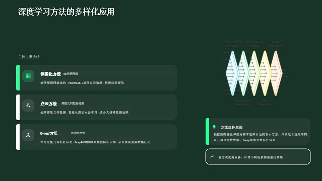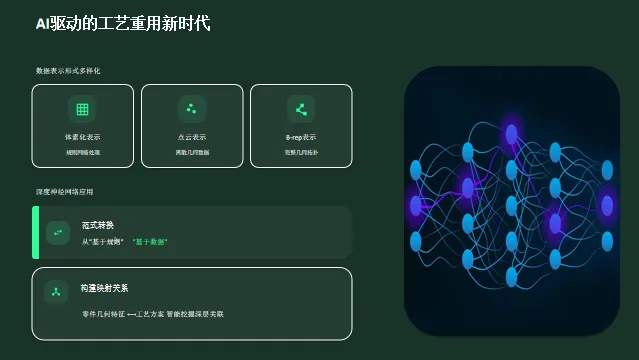 随着人工智能技术的发展,我们迎来了工艺重用的新时代。数据表示形式变得多样化:体素化表示适合处理规则网格结构,点云表示处理离散几何数据,而B-rep表示能够保留完整的几何拓扑信息。这些不同的表示方法各有优势,适用于不同的应用场景。更重要的是深度神经网络的应用,它实现了从"基于规则"到"基于数据"的范式转换。传统的规则方法需要专家定义大量规则,而机器学习模型可以从历史数据中自动学习规律,构建零件几何特征与工艺方案之间的映射关系。这大大提高了工艺重用的智能化水平和自动化程度。