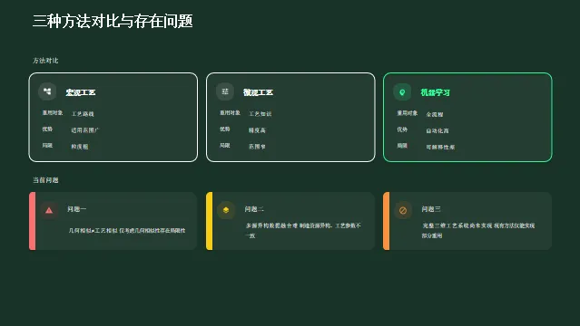 让我们对三种工艺重用方法进行对比分析。宏观工艺重用适用范围广,但粒度较粗;微观工艺重用精度高,但适用范围窄;基于机器学习的方法自动化程度高,但可解释性可能较差。大家可以根据实际需求选择合适的方法。同时我们也要看到当前存在的问题:第一,几何相似不等于工艺相似,一个零件几何相似但工艺可能完全不同;第二,多源异构数据融合困难,制造资源异构、工艺参数不一致等问题突出;第三,完整的三维工艺系统尚未实现。这些问题正是未来研究的重点方向。