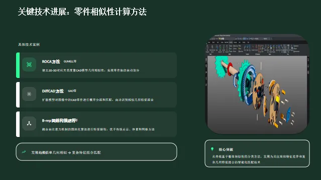 在宏观工艺重用中,零件相似性计算是关键技术。让我介绍几个代表性方法:ROCA方法通过建立2D-3D对应关系来度量CAD模型的几何相似性,实现零件族的自动划分;DiffCAD方法采用扩散模型对CAD零件进行概率分组和匹配,能够自动识别和分类相似的几何特征组合;B-rep图结构描述符方法融合自注意力机制的图池化算法进行特征提取,在模型分类与检索任务中优于传统方法。这些方法展示了从简单几何相似到复杂特征组合匹配的发展趋势,技术越来越智能化、精细化。