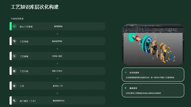 工艺知识库的层次化构建是实现工艺重用的基础。这个层次结构包括六个层级:最顶层是核心工艺骨架,往下依次是工艺网络、工艺路线、工艺片段、工序,最底层是加工操作即工步。这种从宏观到微观的层次化组织方式,每一层对应不同的工艺重用粒度。比如,核心工艺骨架适合企业级的工艺框架重用,而加工操作适合特征级别的参数重用。这种层次化结构使得工艺知识的管理更加系统化,也为后续的智能检索和匹配提供了良好的基础。
