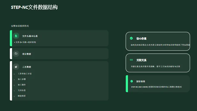 STEP-NC是实现工艺数据标准化的关键技术。它提供了从项目层级到具体工艺细节的完整知识组织形式。文件结构包含三个主要部分:文件头基本信息(文件名、日期、组织机构)、项目数据,以及最重要的工艺数据部分。工艺数据又包括工件和加工计划、加工步骤、加工操作、几何信息和制造特征等关键元素。这种结构化的知识表达方式为语义相似性分析和知识重用提供了坚实基础。STEP-NC是国际标准化的数控加工数据交换格式,采用这个标准可以大大提高工艺数据在不同系统之间的共享和重用能力。
