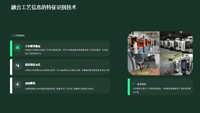 特征识别技术呈现出三大发展趋势。首先是工艺信息集成,从单纯几何特征识别向工艺知识集成发展,通过分析刀具、转速、进给等工艺参数实现工艺知识提取,实现了车间现场工艺经验的数字化和特征级表达。其次是特征表达方式的转变,从传统的预定义特征集合向更灵活的表达方式转变,引入了属性邻接图(AAG)和加工元素有向图等新型表达方法,还有多维属性面边图等复杂特征表达方式。最后是识别算法的智能化,从规则基础方法向智能化算法转变,深度学习方法得到广泛应用,通过增量学习提高特征识别的泛化能力,使识别准确率显著提升。