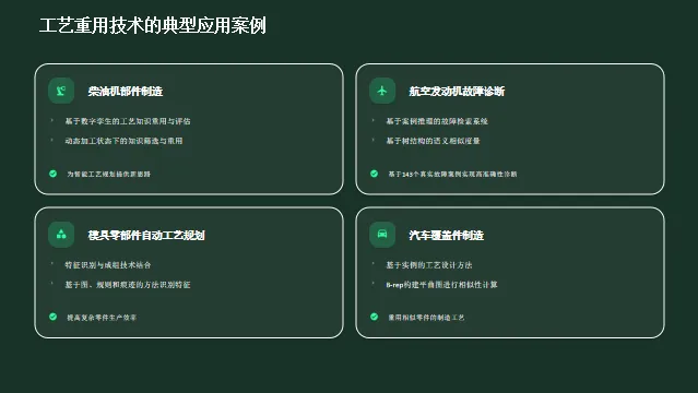让我们看几个典型的应用案例。在柴油机部件制造中,采用基于数字孪生的工艺知识重用与评估方法,实现了动态加工状态下的知识筛选与重用,为智能工艺规划提供了新思路。航空发动机故障诊断系统基于案例推理,通过143个真实故障案例实现了高准确性的故障检索和诊断,为维护人员提供了有效的决策支持。模具零部件自动工艺规划结合特征识别与成组技术,大大提高了复杂零件的生产效率。汽车覆盖件制造采用基于实例的工艺设计方法,通过B-rep构建平曲图进行相似性计算,实现了相似零件制造工艺的重用。这些案例展示了工艺重用技术在不同行业的实际应用价值。
