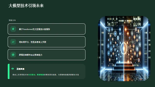 展望未来,基于Transformer的大规模预训练模型将为工艺重用技术带来突破性进展。这些模型凭借庞大的参数规模和强大的表征学习能力,能够有效建模复杂的数据关系。通过自监督预训练与任务特定微调相结合的范式,大模型能够从海量历史工艺数据中挖掘工件几何特征、加工工艺参数以及制造环境约束之间的深层语义关联。特别值得关注的是,在处理非结构化工艺数据和复杂知识表征时,大模型表现出了显著的优势,其强大的跨模态理解和知识推理能力,有望突破传统基于规则的方法局限,推动工艺重用技术向知识驱动、数据赋能的更高层次演进。