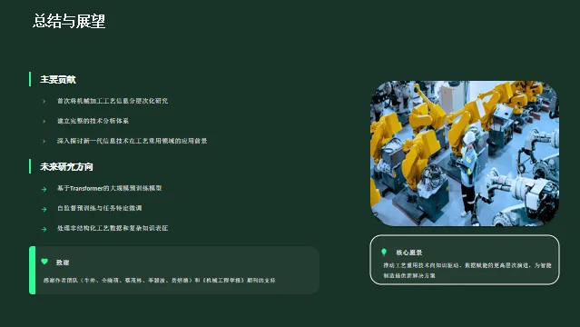 让我们对今天学习的内容做一个总结。这项研究的核心贡献在于首次将机械加工工艺信息分层次化研究,建立了完整的技术分析体系,并深入探讨了新一代信息技术在工艺重用领域的应用前景。这为我们推动制造业数字化转型提供了新的研究思路。关于未来研究方向,我们重点关注基于Transformer的大规模预训练模型,通过自监督预训练与任务特定微调相结合,处理非结构化工艺数据和复杂知识表征。这些都是前沿的技术方向,值得大家持续关注。最后,感谢牛帅博士团队和《机械工程学报》期刊的贡献,让我们有机会学习到如此前沿的研究成果。