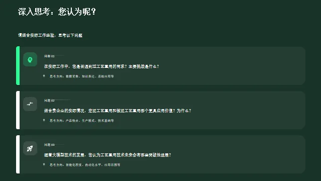 现在进入我们的思考环节。我给大家准备了三个问题,希望大家结合自己的实际工作经验来思考。第一个问题:在实际工作中,您是否遇到过工艺重用的需求?主要挑战是什么?是数据采集困难,还是知识表达不清,或者是系统应用受限?第二个问题:结合贵企业的实际情况,宏观工艺重用和微观工艺重用哪个更具应用价值?为什么?第三个问题:随着大模型技术的发展,您认为工艺重用技术未来会有哪些突破性进展?请大家花几分钟时间思考这些问题,稍后我们可以一起讨论。这些问题没有标准答案,关键是要结合实际来思考。