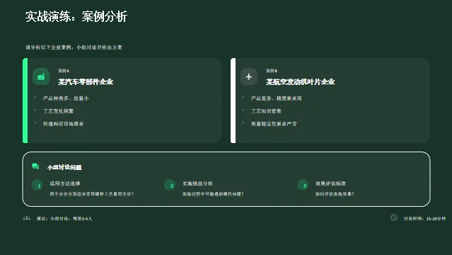 接下来让我们通过案例分析来巩固所学知识。这里有两个典型的企业案例:案例A是某汽车零部件企业,产品种类多、批量小、工艺变化频繁;案例B是某航空发动机叶片企业,产品复杂、精度要求高、工艺知识密集。请大家思考三个问题:第一,两个企业分别适合采用哪种工艺重用方法?第二,实施过程中可能遇到哪些问题?第三,如何评估实施效果?大家可以分组讨论,每组3-5人,讨论时间15-20分钟。讨论完成后,我们会邀请代表分享观点。这个案例讨论的目的是帮助大家将理论知识应用到实际场景中,加深理解。