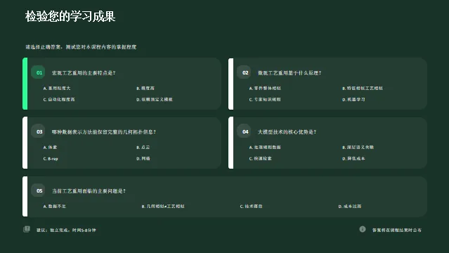 现在让我们通过一些选择题来检验今天的学习成果。这里有5道题目,涵盖了今天学习的核心内容。第一题:宏观工艺重用的主要特点是什么?是重用粒度大、精度高、自动化程度高,还是依赖预定义模板?第二题:微观工艺重用基于什么原理?第三题:哪种数据表示方法能保留完整的几何拓扑信息?第四题:大模型技术的核心优势是什么?第五题:当前工艺重用面临的主要问题是什么?请大家独立完成,时间5-8分钟。这些题目可以帮助大家巩固重点知识,找出需要进一步学习的薄弱环节。