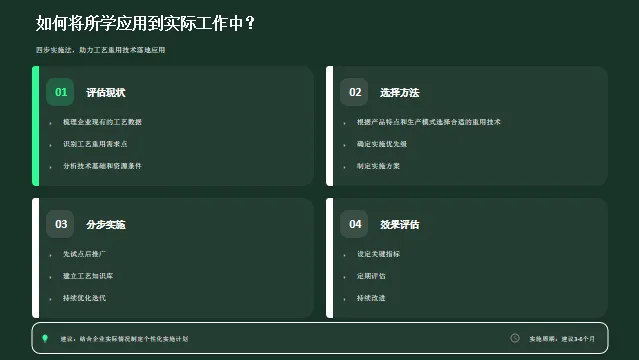 学以致用是我们培训的最终目的。让我给大家提供一个四步实施法,帮助大家将工艺重用技术应用到实际工作中。第一步是评估现状:梳理企业现有的工艺数据,识别工艺重用的需求点,分析技术基础和资源条件。只有了解现状,才能有针对性地制定方案。第二步是选择方法:根据产品特点和生产模式选择合适的重用技术,确定实施的优先级。第三步是分步实施:建议采用先试点后推广的策略,建立工艺知识库,并进行持续优化迭代。不要贪大求全,要稳扎稳打。第四步是效果评估:设定关键指标,定期评估实施效果,持续改进。这四步法简单实用,希望能为大家提供行动指南。