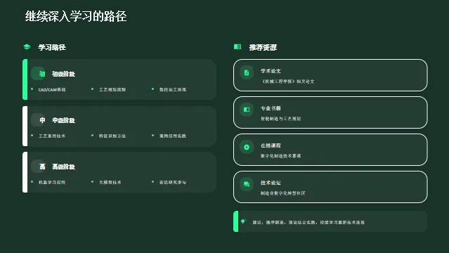 今天的培训只是一个开始,智能制造是一个不断发展的领域。我为大家规划了三个学习阶段:初级阶段要掌握CAD/CAM基础,了解工艺规划流程,熟悉数控加工原理;中级阶段要深入学习工艺重用技术,掌握特征识别方法,进行案例应用实践;高级阶段要研究机器学习在工艺规划中的应用,探索大模型技术,参与前沿研究。推荐资源包括学术论文、智能制造与工艺规划的专业书籍、数字化制造技术的在线课程,以及制造业数字化转型的技术论坛。学习是一个持续的过程,希望大家能够保持学习的热情,不断提升自己的专业能力。