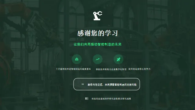 到这里,我们的培训课程就要结束了。让我们回顾一下今天的学习内容:我们从智能制造的发展历程开始,了解了工艺重用技术的核心价值;深入学习了宏观工艺重用、微观工艺重用和基于机器学习的工艺重用三大技术维度;探讨了技术进展、应用案例和未来发展方向;最后还进行了思考题、案例分析和知识自测等互动环节。工艺重用技术是智能制造的重要基石,掌握这些技术将助力企业数字化转型,提升制造业核心竞争力。感谢大家的认真学习和积极参与!期待与大家保持交流,共同探索智能制造的无限可能。