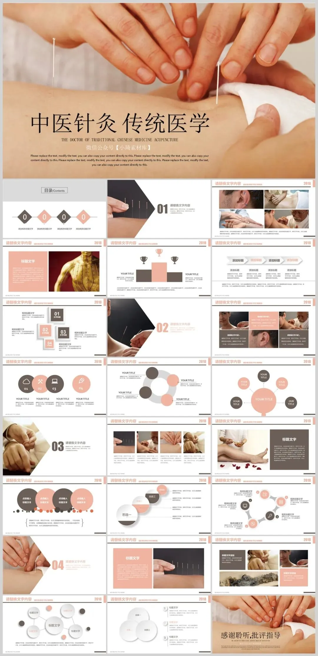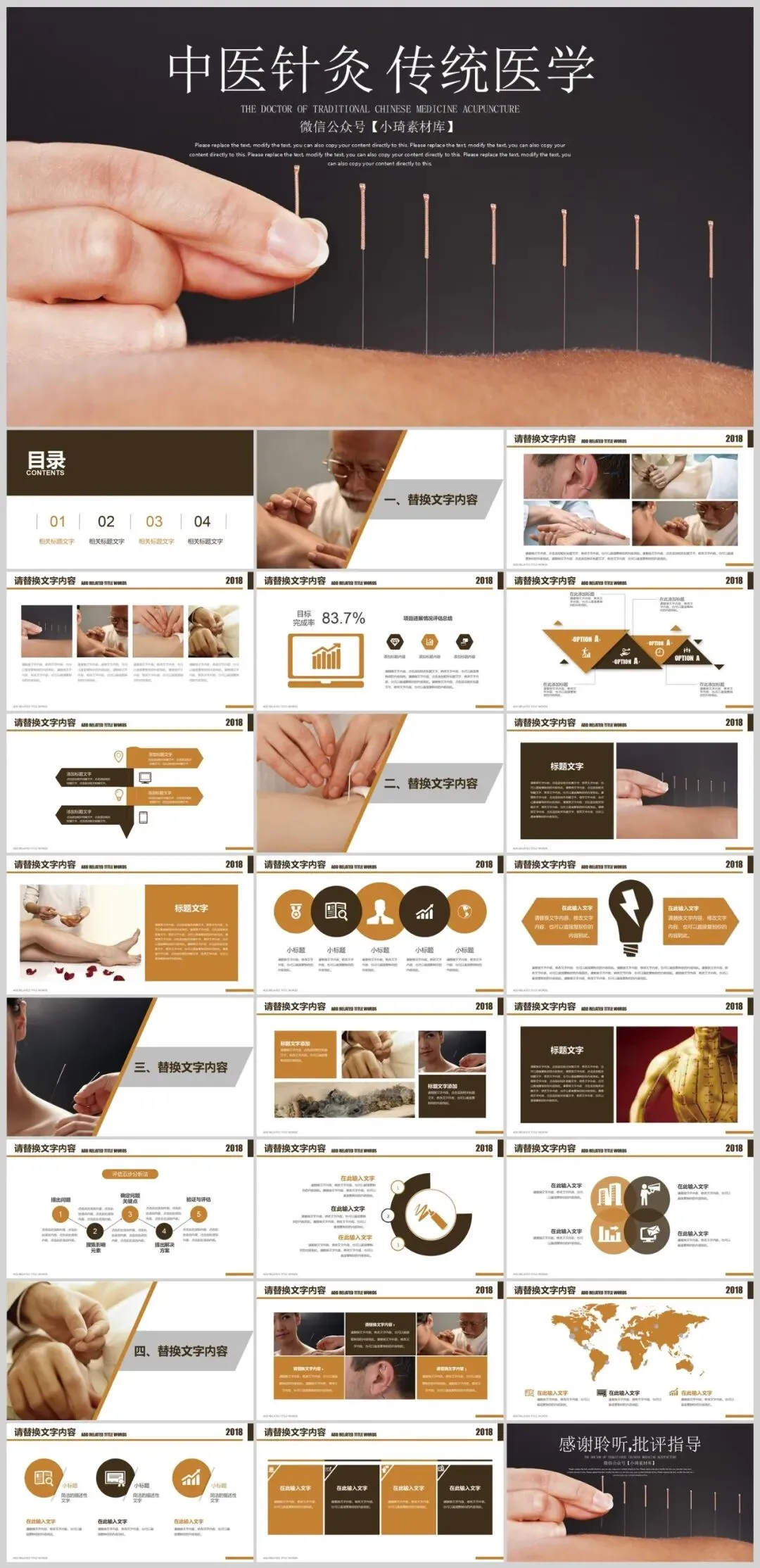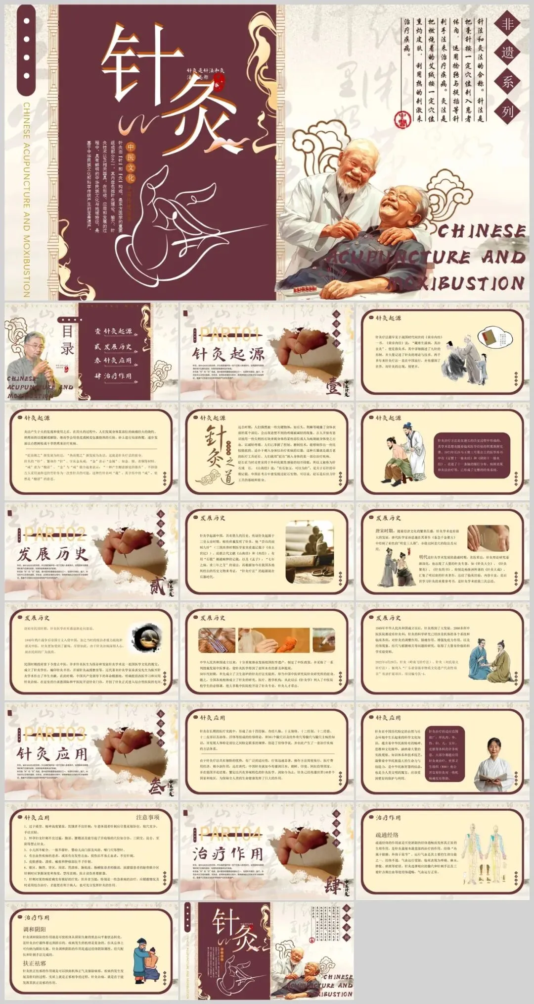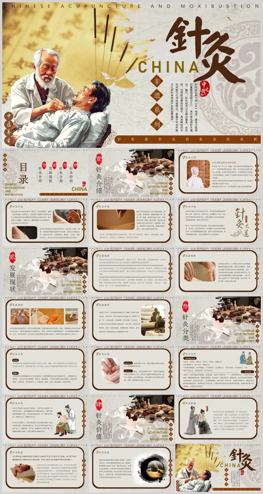 针灸是我国古代劳动人民创造的一种独特的医疗方法,有着悠久的历史。几千年来,人们利用金属针具或艾炷、艾卷,在人体特定的部位进针施灸,用以治疗疾病,解除病痛,并由此创立了独具特色的人体经络腧穴理论,成为中国医学的一枝奇葩,在世界上享有盛誉。针灸是中国古代劳动人民创造的一种独特的医疗方法,是国家级非物质文化遗产之一。4套中医传统医学针灸PPT模板