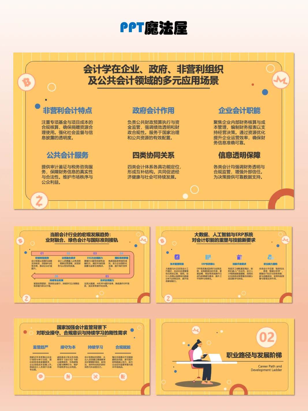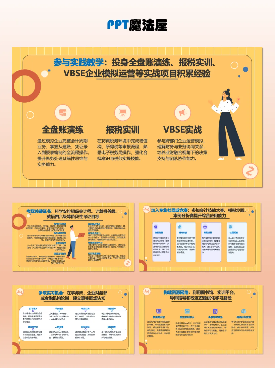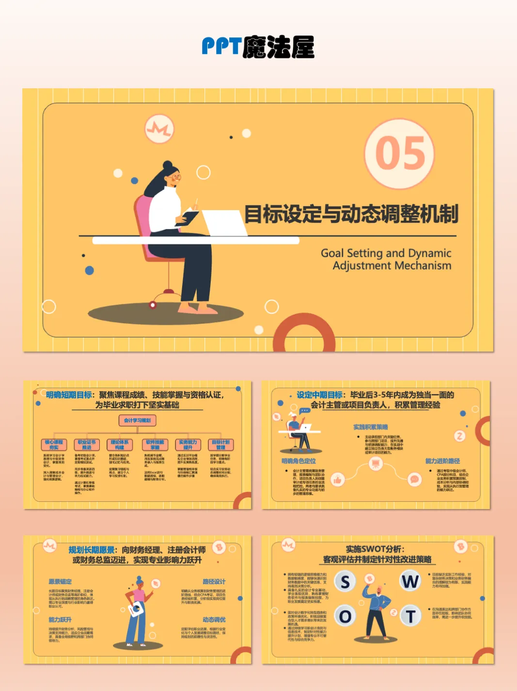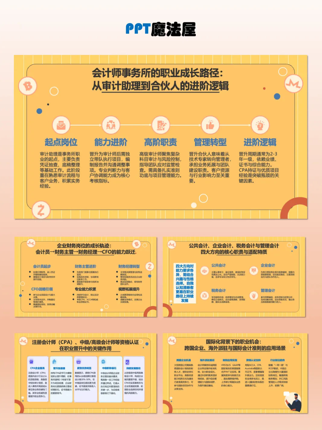 🥱熬了一个通宵,给各位学会计学的宝宝们设计了一款职业生涯规划PPT哦! ✅内容分为六大部分,每个部分的内容都非常翔实,具体宝宝们可以点开大图看哦!一定能为你的职业生涯规划起到不小的参考作用的,结合自己的情况改改应该就能用了。 🙏祝福宝宝们都能拥有一个美好的职业生涯!