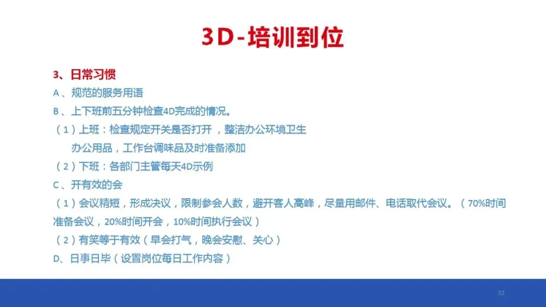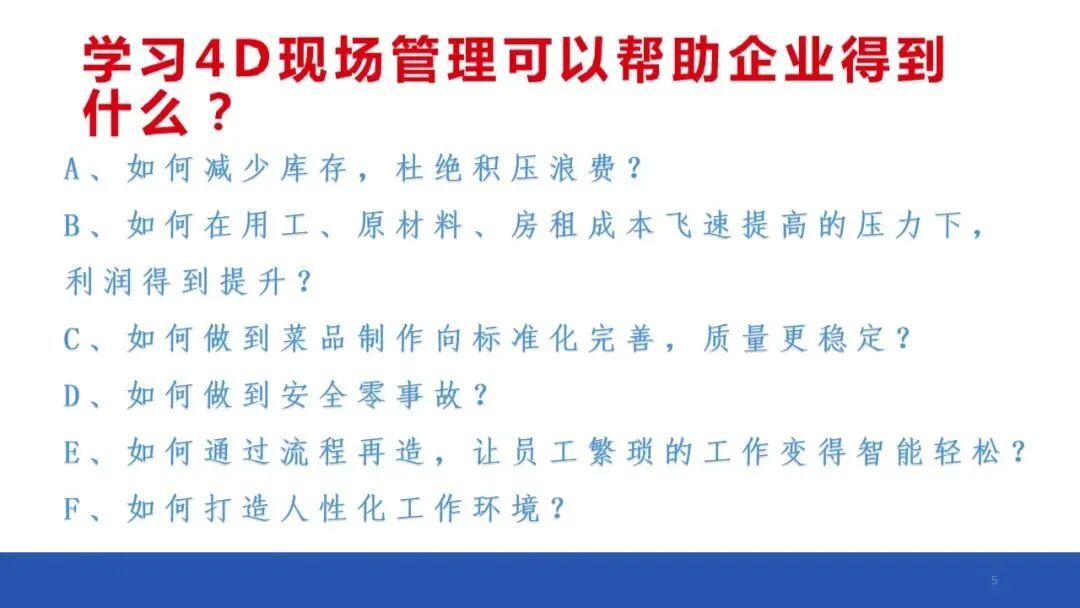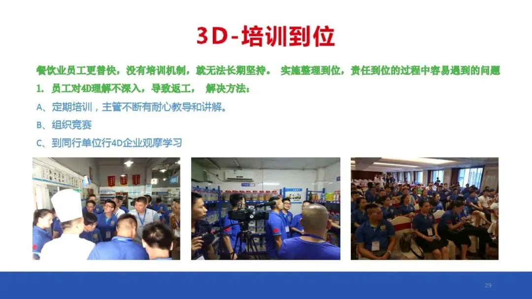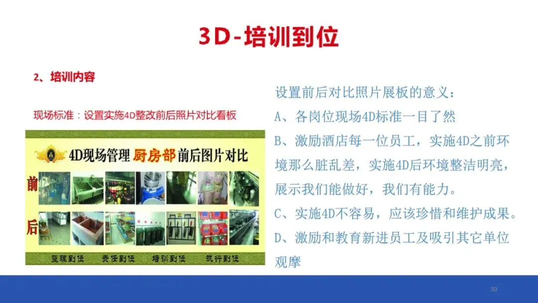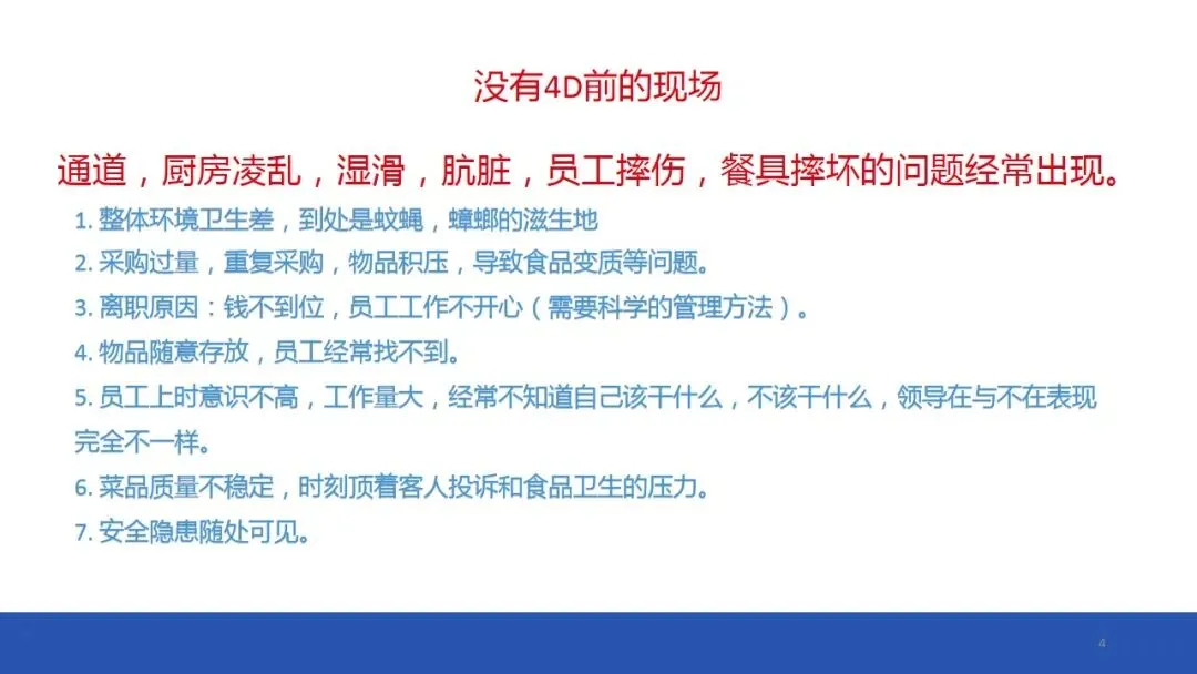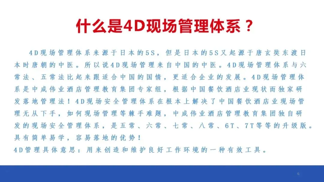 4D现场管理体系是中成伟业酒店管理教育集团专家组,根据中国餐饮酒店业现状而独家研发落地管理法!4D现场安全管理体系在根本上解决了中国餐饮酒店业现场管理无从下手,如何现场管理等棘手难题,中成伟业酒店管理教育集团独自研发的现场安全管理体系,是五常、六常、七常、八常、6T、7T等等的升级版。具有简单易学,容易落地的优势!