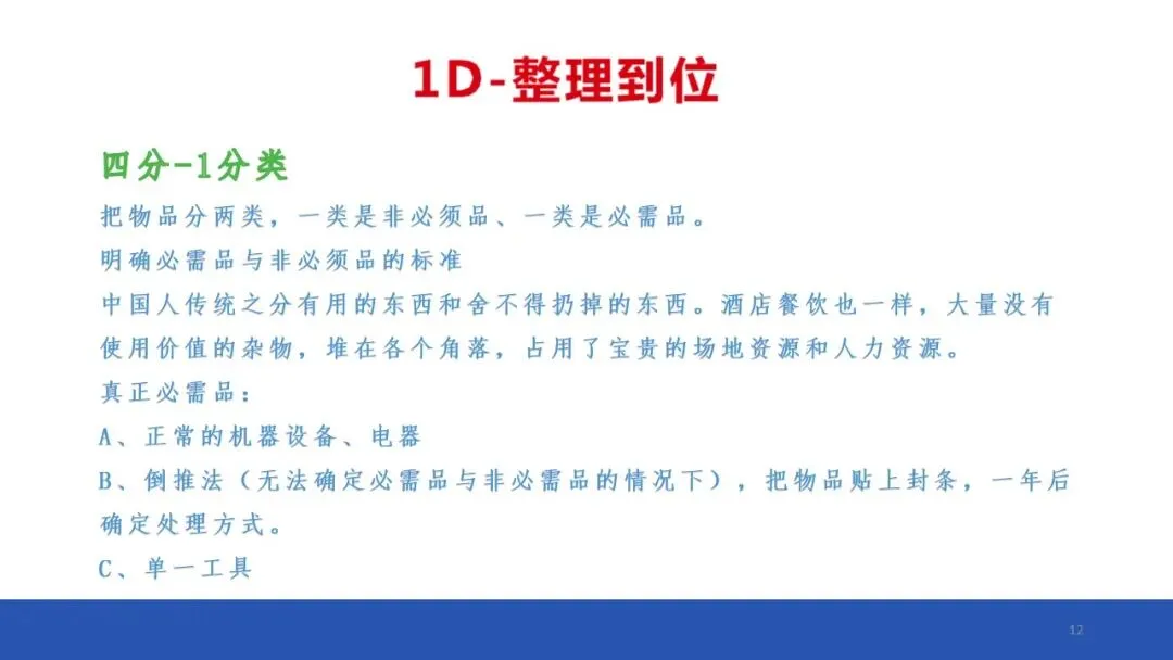 判断必须与非必须的物品并将必须物品的数量降低到最低程度,将非必须的物品清理掉。必须品以最低安全用量明确标识、摆放整齐,做好清洁。