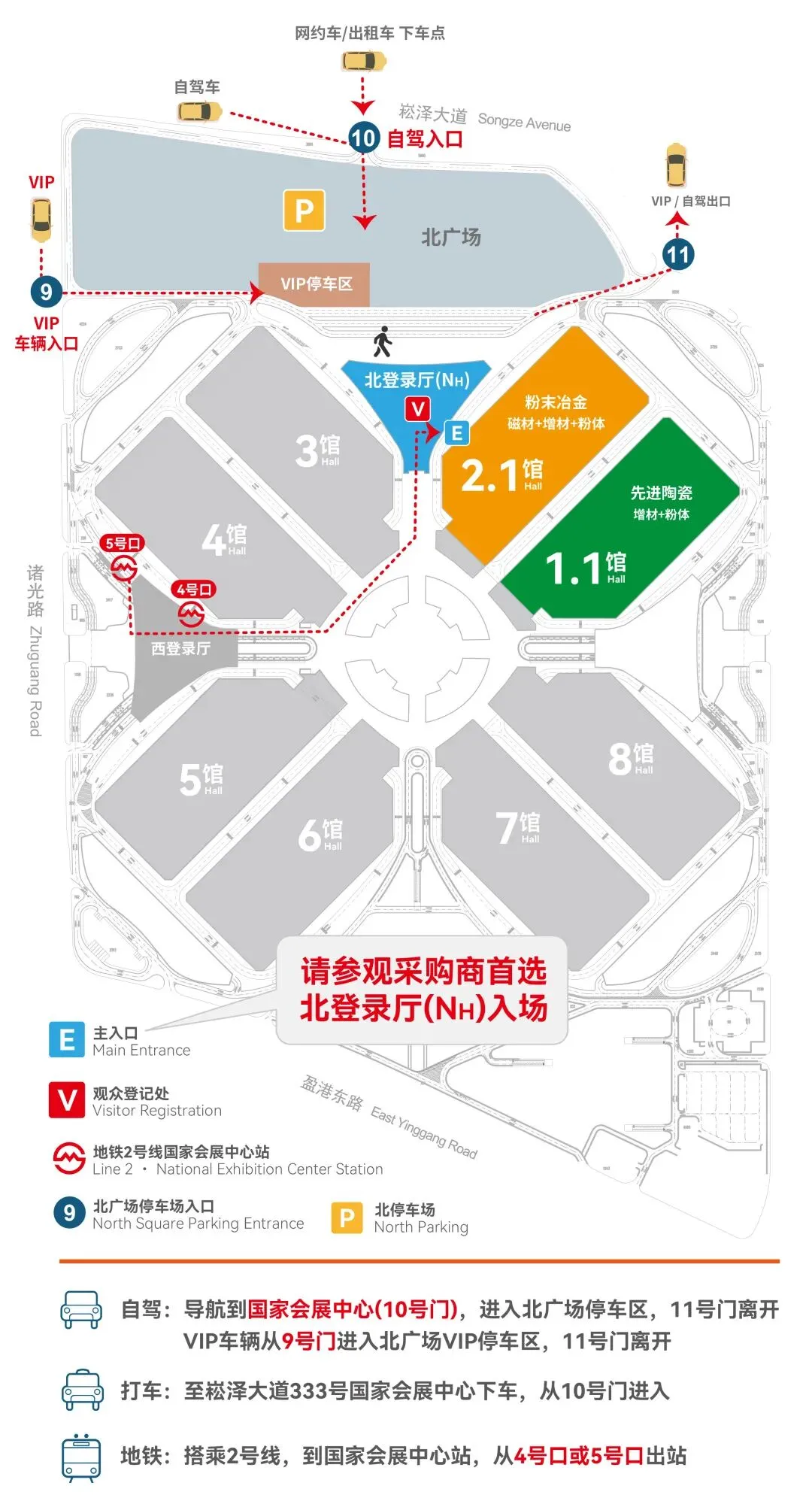 导航到国家会展中心(10号门),进入北广场停车区,11号门离开;VIP车辆从9号门进入北广场VIP停车区,11号门离开。