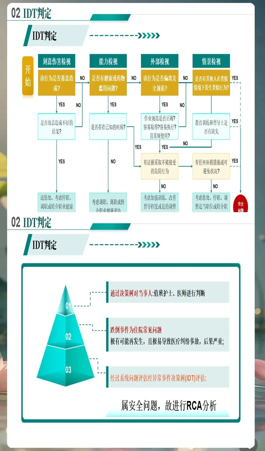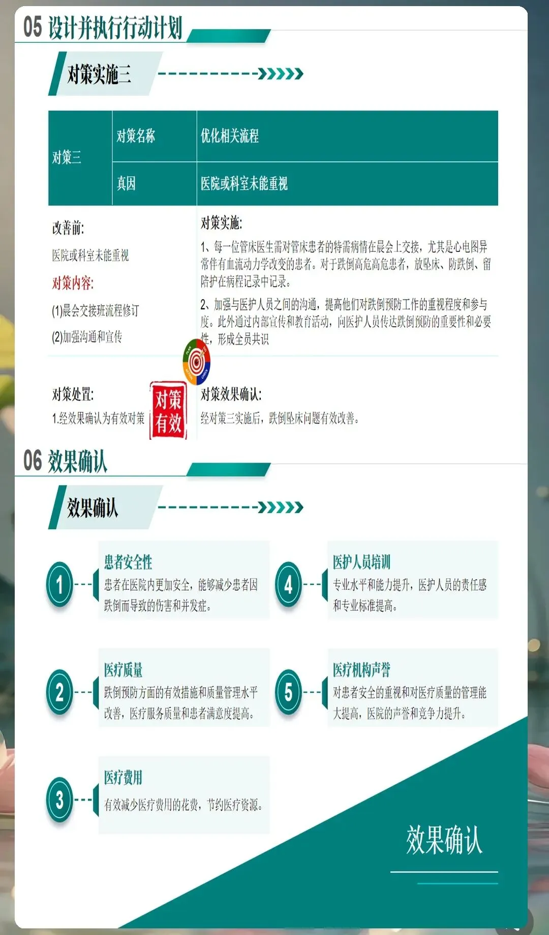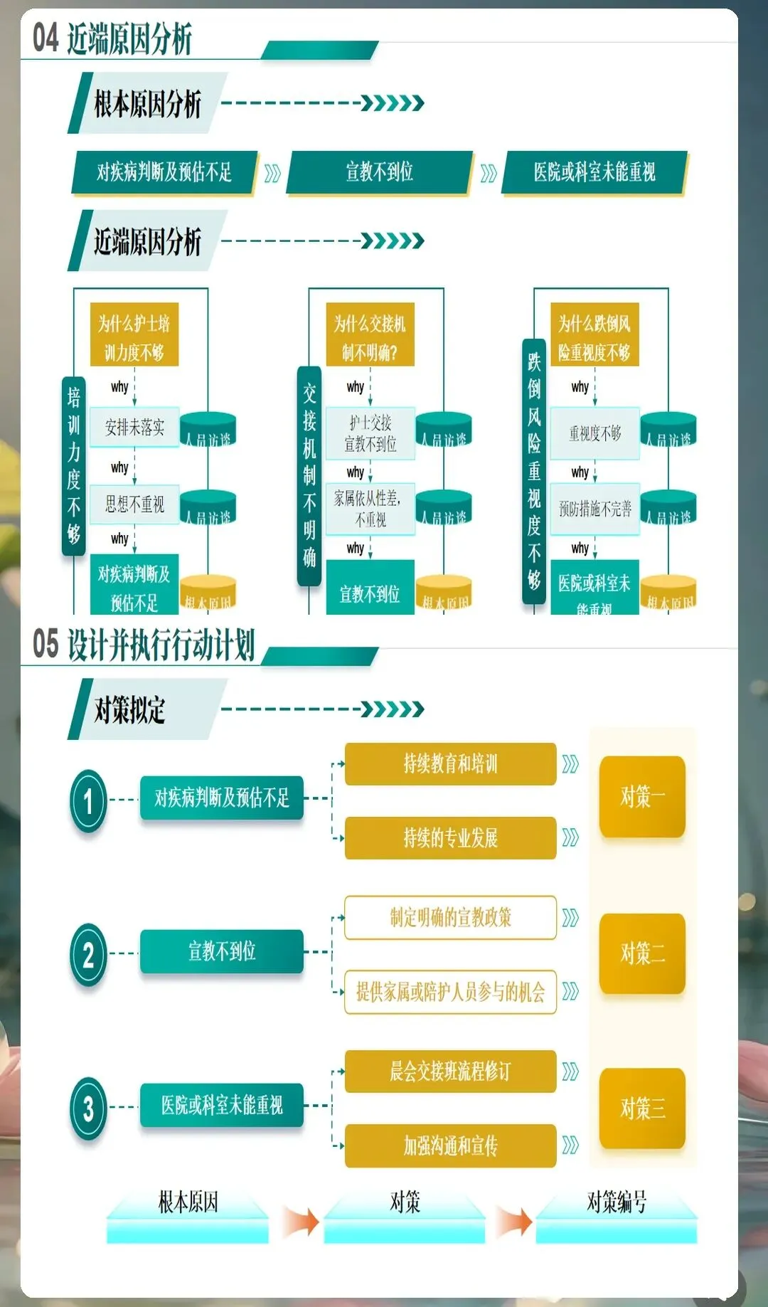 间接原因分析从系统层面识别问题,包括人员、设备、环境、流程、管理等维度。人员维度分析发现,护士对认知功能受损患者的风险识别不足;设备维度分析发现,床栏设计存在缺陷,患者可自行解除;环境维度分析发现,夜间照明不足,卫生间标识不清;流程维度分析发现,高风险患者夜间巡视流程不够细化;管理维度分析发现,陪护管理制度执行不到位。