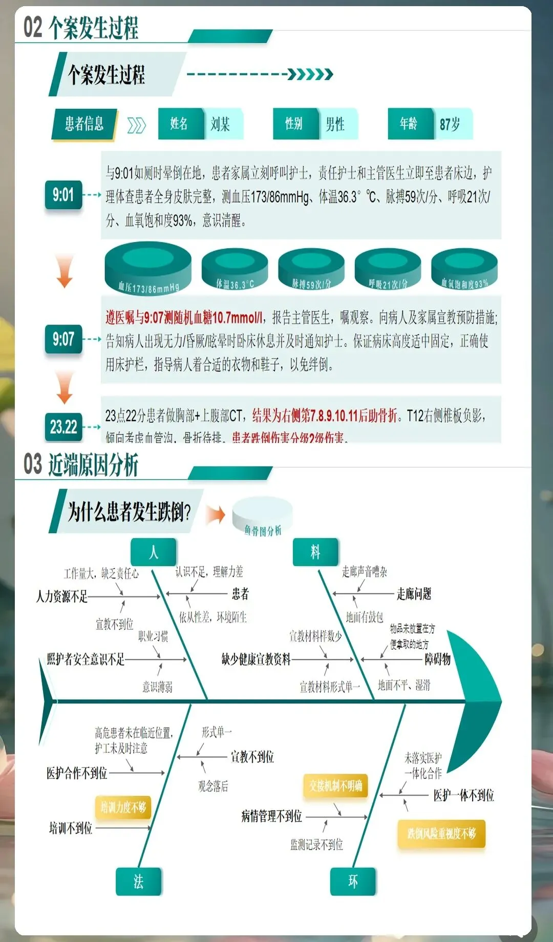 该事件发生在夜间2点,患者为76岁男性,因肺部感染入院,有高血压、糖尿病、脑梗死后遗症等基础疾病。患者存在认知功能轻度受损,夜间兴奋明显。跌倒发生时,患者自行下床如厕,病房光线昏暗,床栏未完全拉起,未使用跌倒预防辅助器具。