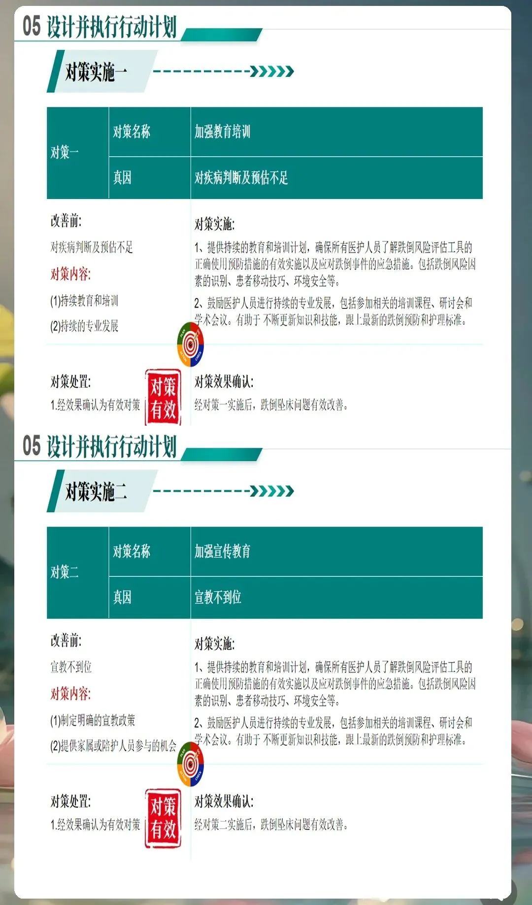 根本原因分析采用鱼骨图工具,从人员、设备、材料、方法、环境、管理六个维度系统梳理。通过分析发现,根本原因包括:风险评估工具对认知功能受损患者的识别敏感度不足;护士对认知功能受损患者的风险认知不足;跌倒预防辅助器具种类单一,不能满足不同患者的需求;夜间高风险患者巡视流程缺乏具体操作指导;家属陪护管理缺乏弹性机制等。
