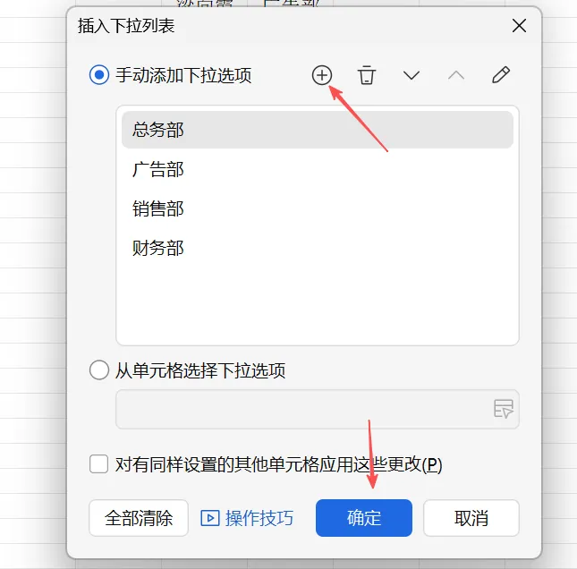 大功告成!现在点击B2:B10区域内的任意单元格,右侧都会出现下拉箭头,点击即可从预设的部门列表中选择。