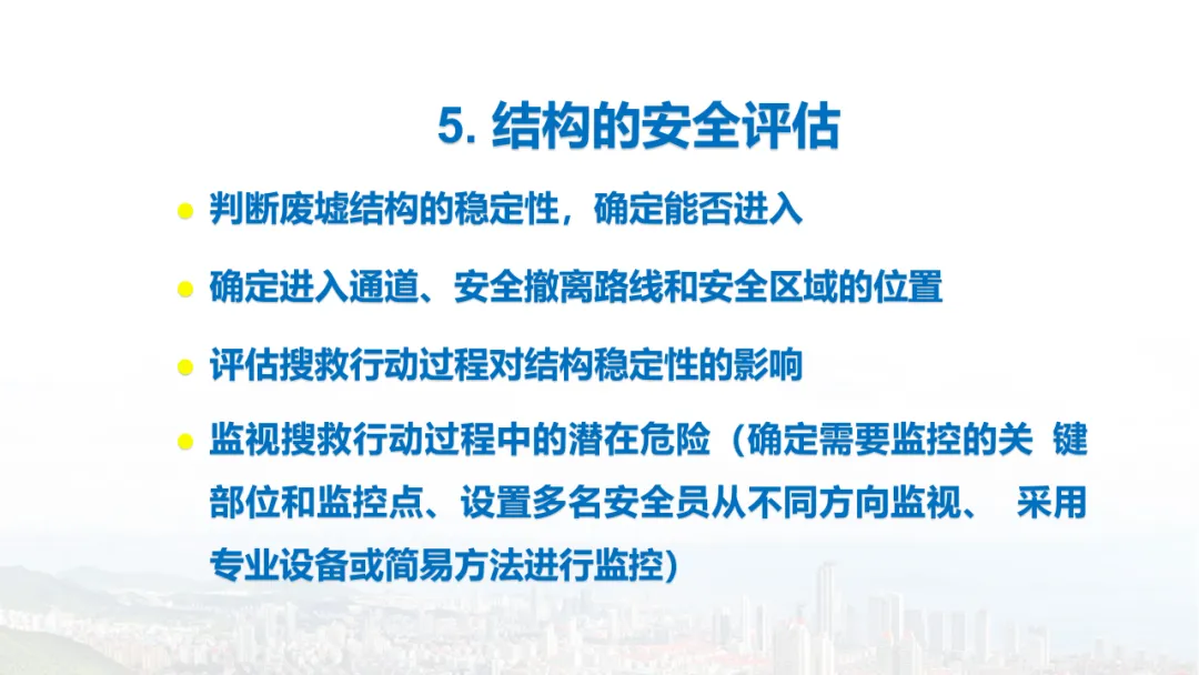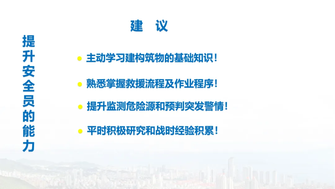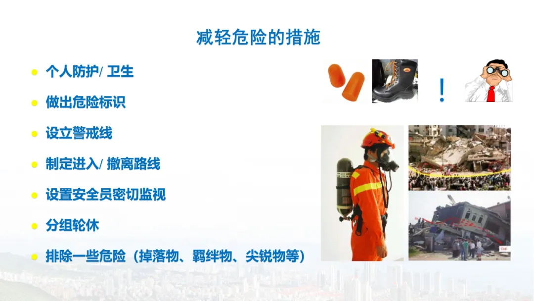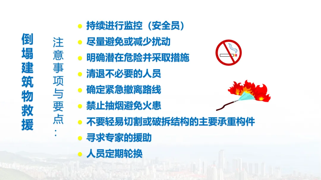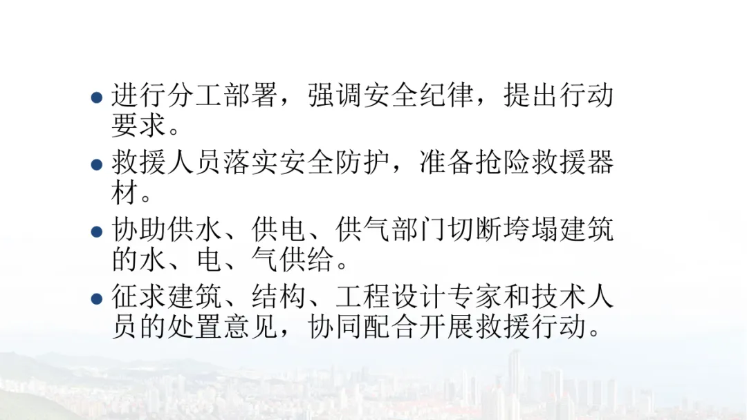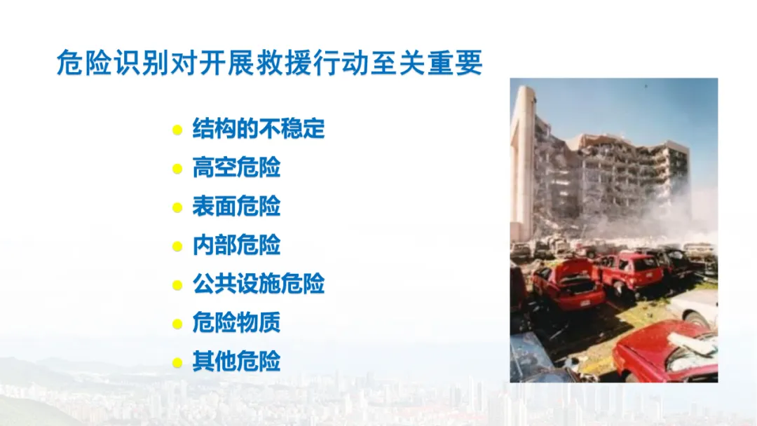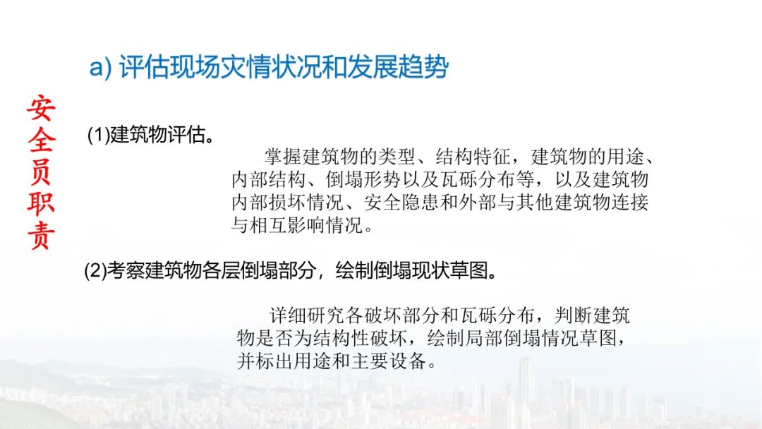 主旨内容:该课件围绕建筑物结构倒塌的危险识别及防范展开,先介绍建筑结构基础知识,包括建筑结构组成、不同结构类型特点等。接着分析结构震害原因与破坏等级,列举层叠式、倾斜式、“V”形、“A”形等倒塌类型。然后指出救援中存在结构不稳定、高空坠落、危险物质等潜在危险,强调危险识别的重要性。还阐述了废墟结构安全评估要点,以及侦察检测、救援准备、搜救施救等处置程序与措施,同时明确了安全员的职责与能力提升方向。