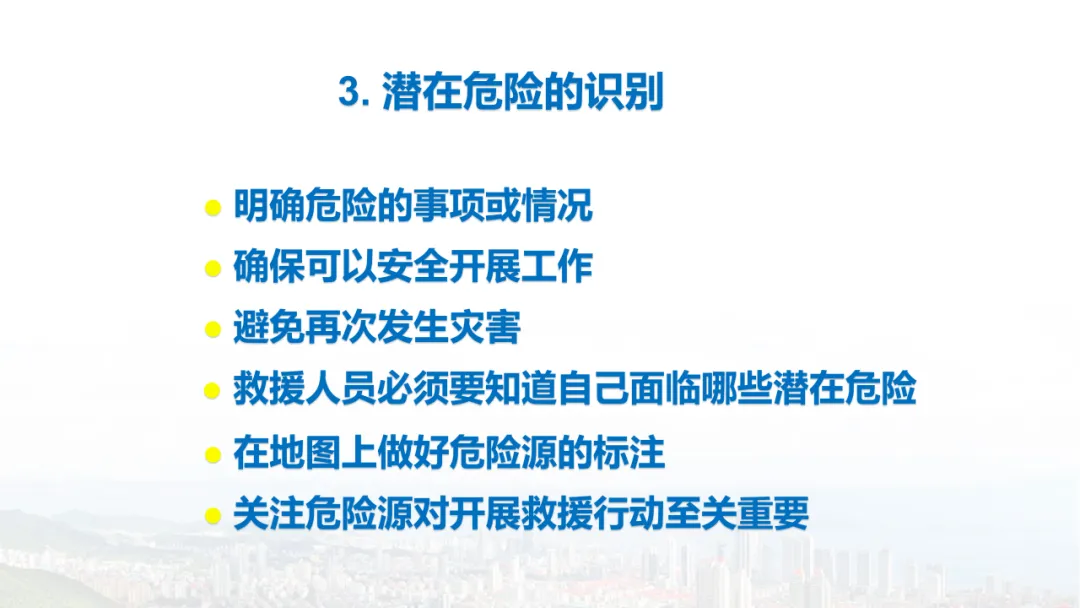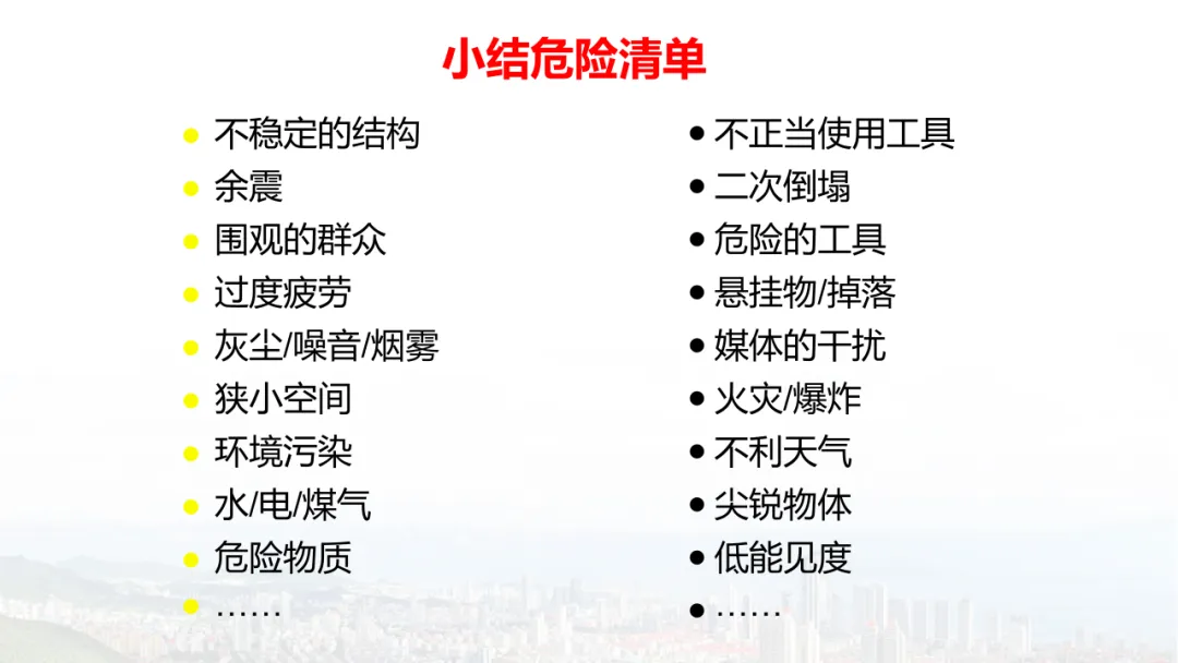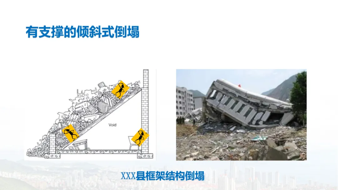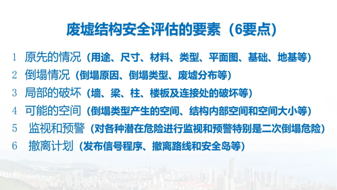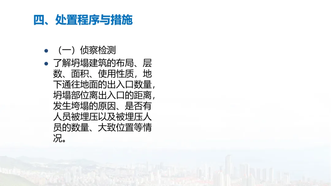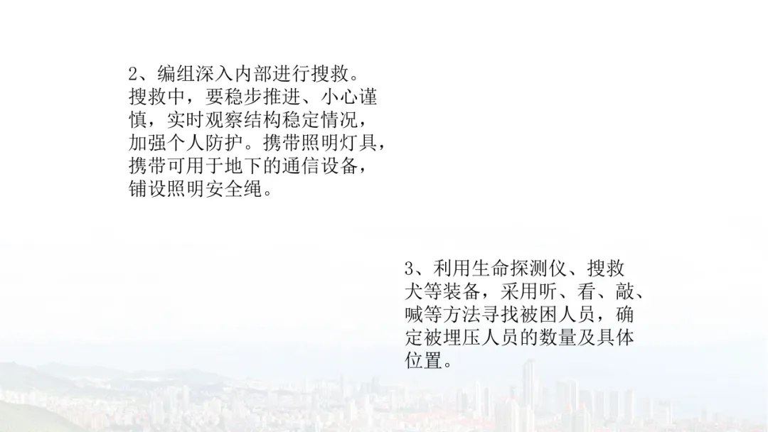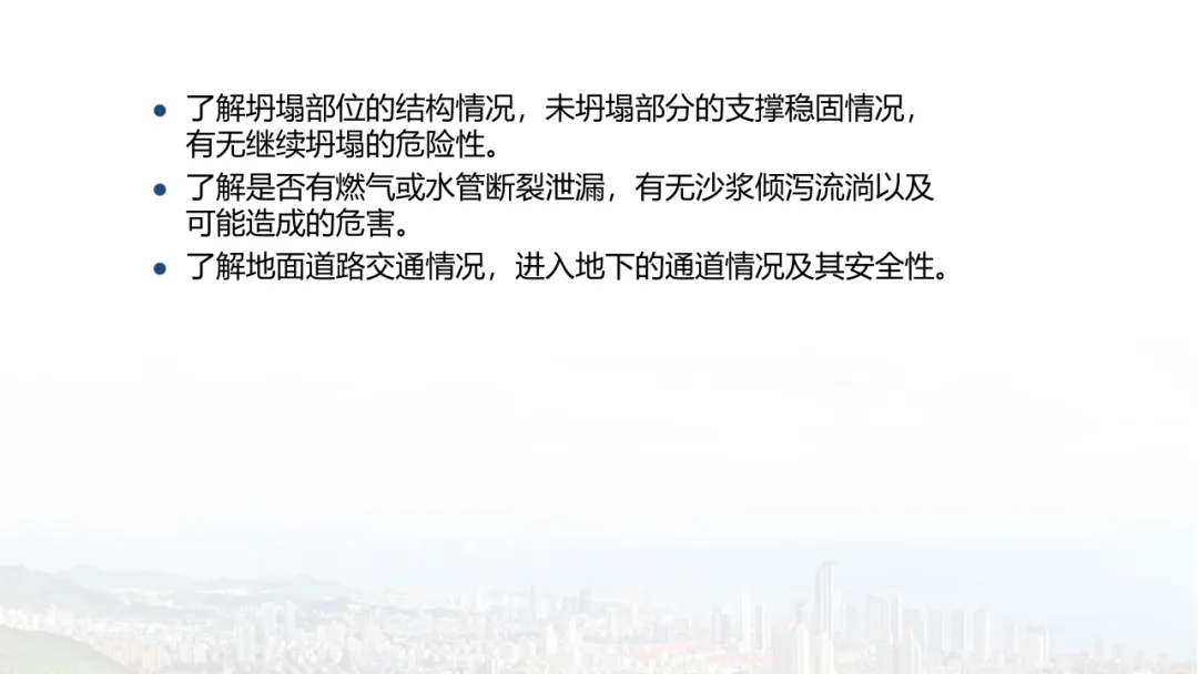 主旨内容:该课件围绕建筑物结构倒塌的危险识别及防范展开,先介绍建筑结构基础知识,包括建筑结构组成、不同结构类型特点等。接着分析结构震害原因与破坏等级,列举层叠式、倾斜式、“V”形、“A”形等倒塌类型。然后指出救援中存在结构不稳定、高空坠落、危险物质等潜在危险,强调危险识别的重要性。还阐述了废墟结构安全评估要点,以及侦察检测、救援准备、搜救施救等处置程序与措施,同时明确了安全员的职责与能力提升方向。