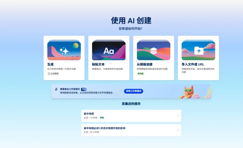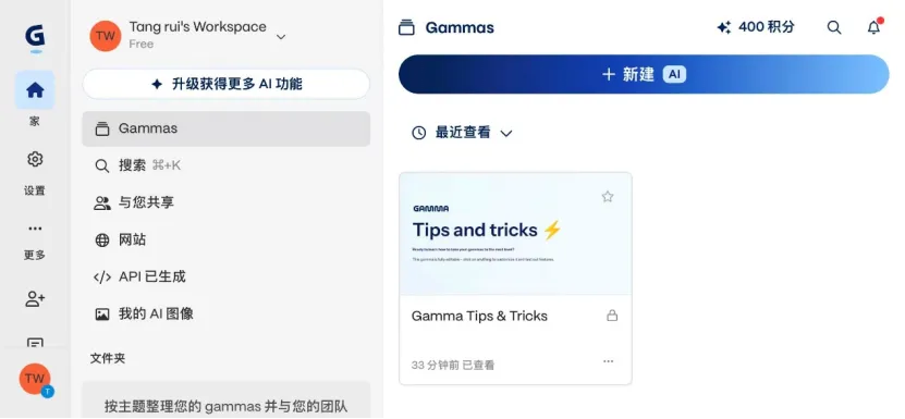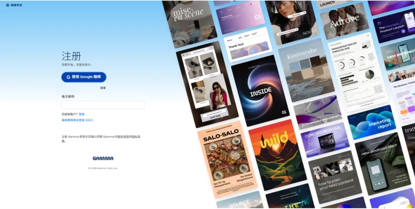 打开Gamma 官网(国内网络可直接访问,支持中文),用邮箱注册登录后(国内邮箱即可),你会看到一个非常干净的界面。
