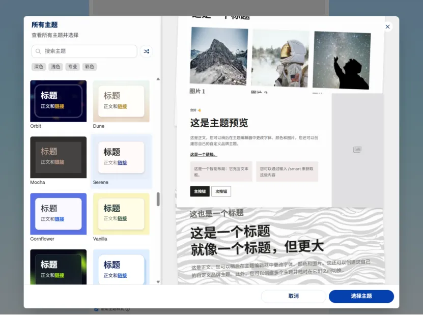 接下来,Gamma 会提供几十种不同风格的主题模板(Theme)。有科技风、极简风、自然风、活泼风……