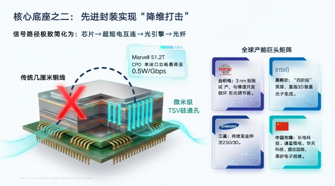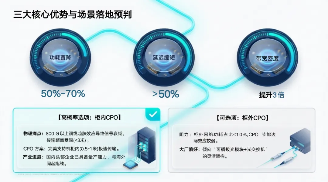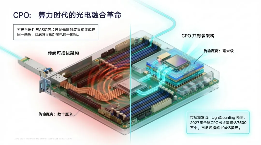 以及各类Skill,本质上是AI在应用侧的一次大爆发,我们先不讨论这些技术能带来的价值有多大,但这场狂欢之中,云厂商把云卖出去了,大模型厂商把Token卖出去了,而这一切同时也在倒逼AI算力以及光通信技术迎来颠覆性变革。其中CPO(共封装光学)又是光通信的重要环节,其原理是通过将光引擎与交换芯片共封装,从而突破传统光模块功耗瓶颈——