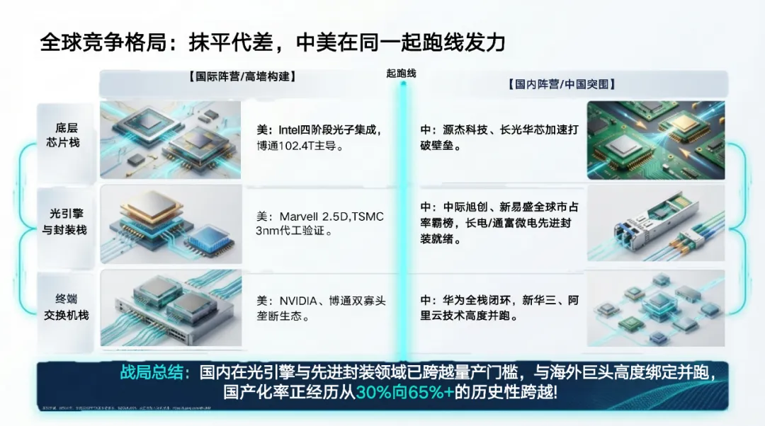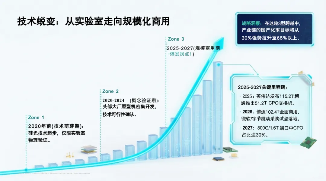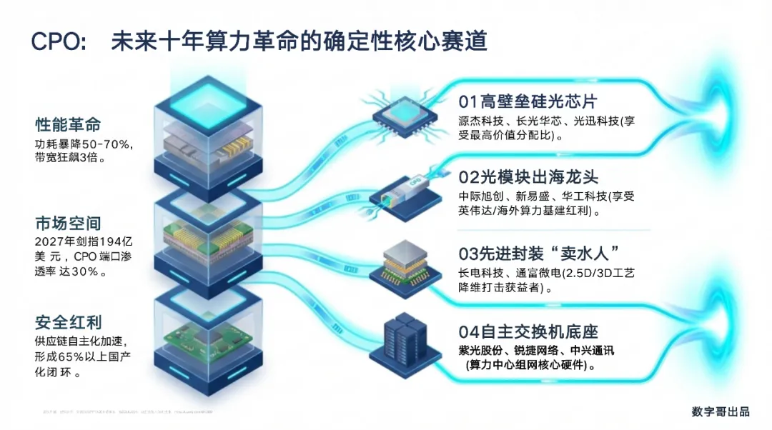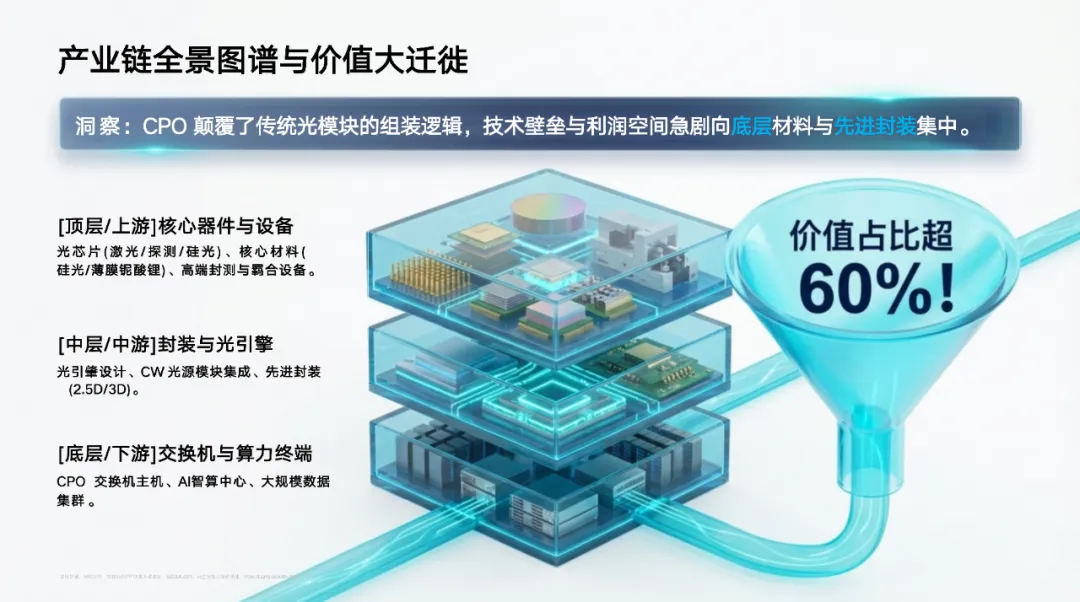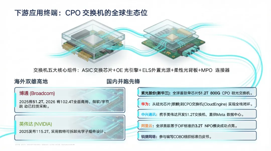 ,渗透率突破30%。从硅光芯片、高功率激光器到先进封装,产业链价值正经历根本性重塑。英伟达、博通竞相发布51.2T/115.2T CPO交换机,国内厂商同步加速国产替代。当光电共封装从实验室走向规模化量产,一场关乎未来十年算力格局的产业革命已悄然启幕,谁将是是这场角逐的赢家?