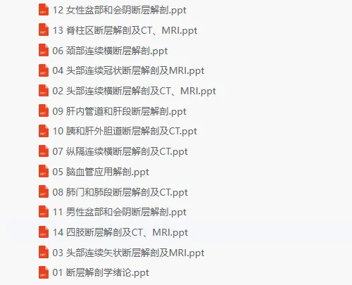 此资源为断层解剖学系列PPT,包含从头部到四肢的详细断层解剖知识,涉及颈部、头部、脊柱区、盆部和会阴、纵隔、肺门、肝内管道等多个部位的断层解剖及CT、MRI图像分析。内容丰富,结构清晰,适合医学生和专业人士学习。涵盖断层解剖学的基础知识和实际应用,是学习解剖学的宝贵资料。