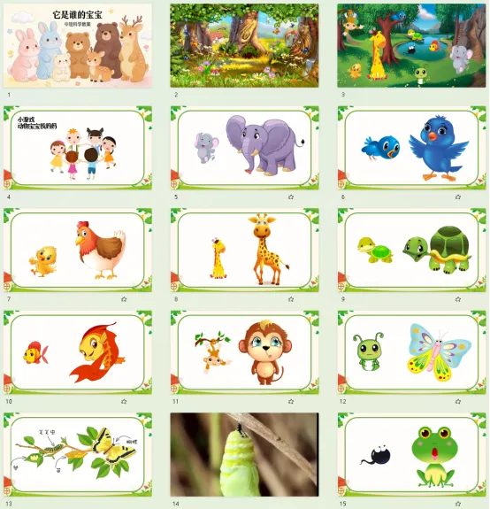 活动重点:观察、发现动物宝宝和动物妈妈的异同,并用语言表述出来。
