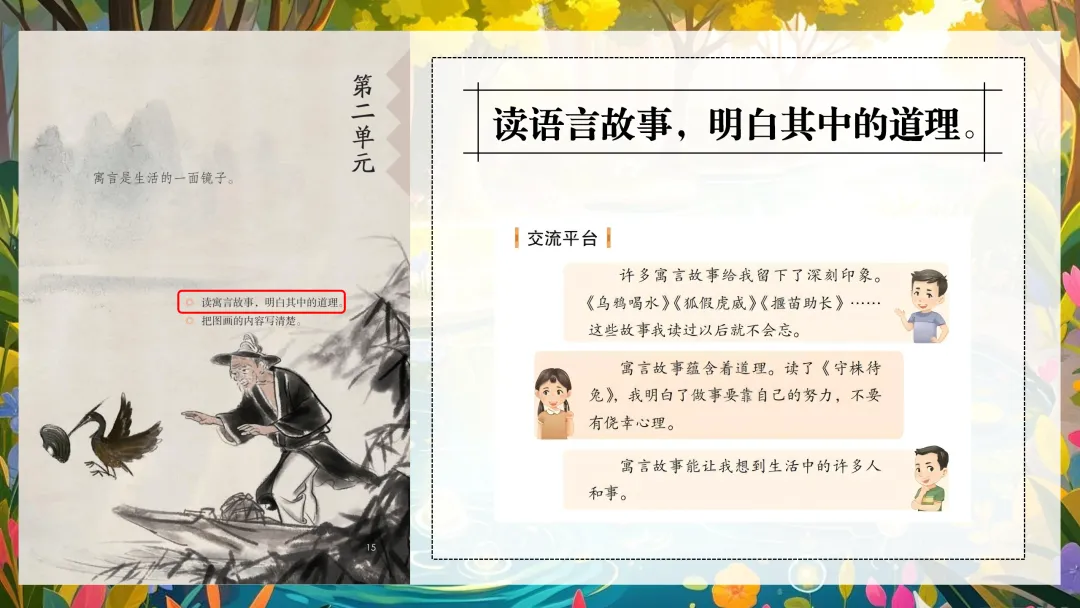 师:寓言中的很多角色都是会说话的!有没有比出不一样的?