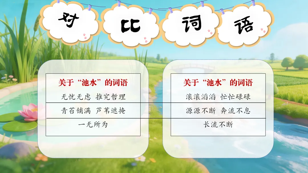 预设:第一组词语是描写池子无所事事的生活,而第二组词语是描写河流忙碌的生活。