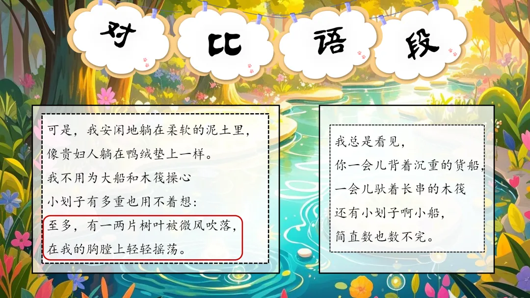 预设:通过这两个语段的对比,我发现池子是无所事事,安闲清逸,而河流是忙碌辛劳的。
