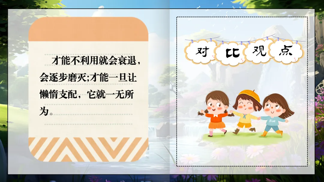 预设:作者的观点是——才能不利用就会衰退,会逐步磨灭;才能一旦让懒惰支配,它就一无所为。(PPT出示语段)