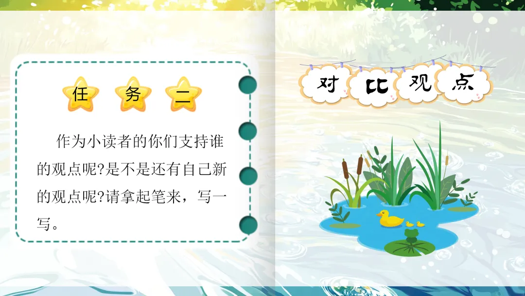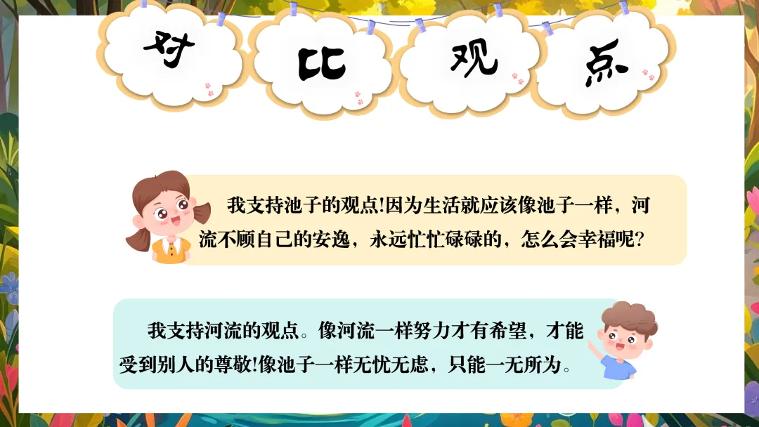 师:学到现在,我们发现,池子有池子的观点,河流有河流的观点,作者有作者的观点。接下去我们就来比一比观点,好不好?